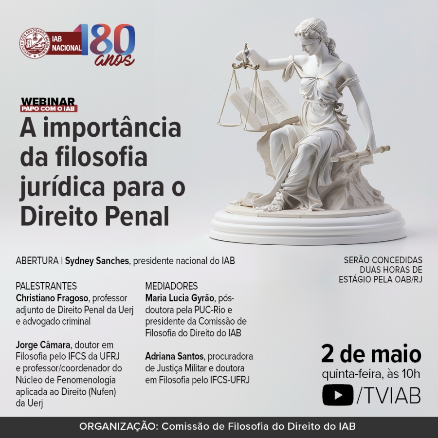 A presidente da Comissão de Filosofia do Direito do IAB, Maria Lucia Gyrão, e a procuradora de Justiça Militar e doutora em Filosofia pelo Instituto de Filosofia e Ciências Sociais da Universidade Federal do Rio de Janeiro (IFCS-UFRJ) Adriana Santos ficarão a cargo da mediação do encontro. Os estudantes de Direito que assistirem ao webinar receberão duas horas de estágio pela OAB/RJ.