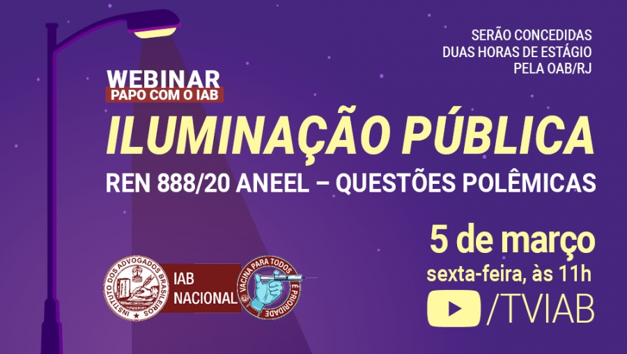 Organizado pela Comissão de Direito de Energia Elétrica do IAB, presidida por Bernardo Gicquel, o webinar Papo com o IAB será aberto pela presidente nacional, Rita Cortez. Aos estudantes de Direito que participarem do evento serão concedidas duas horas de estágio pela OAB/RJ. A participação é gratuita. O controle será feito pelo chat, onde o aluno deverá se identificar com nome e e-mail.