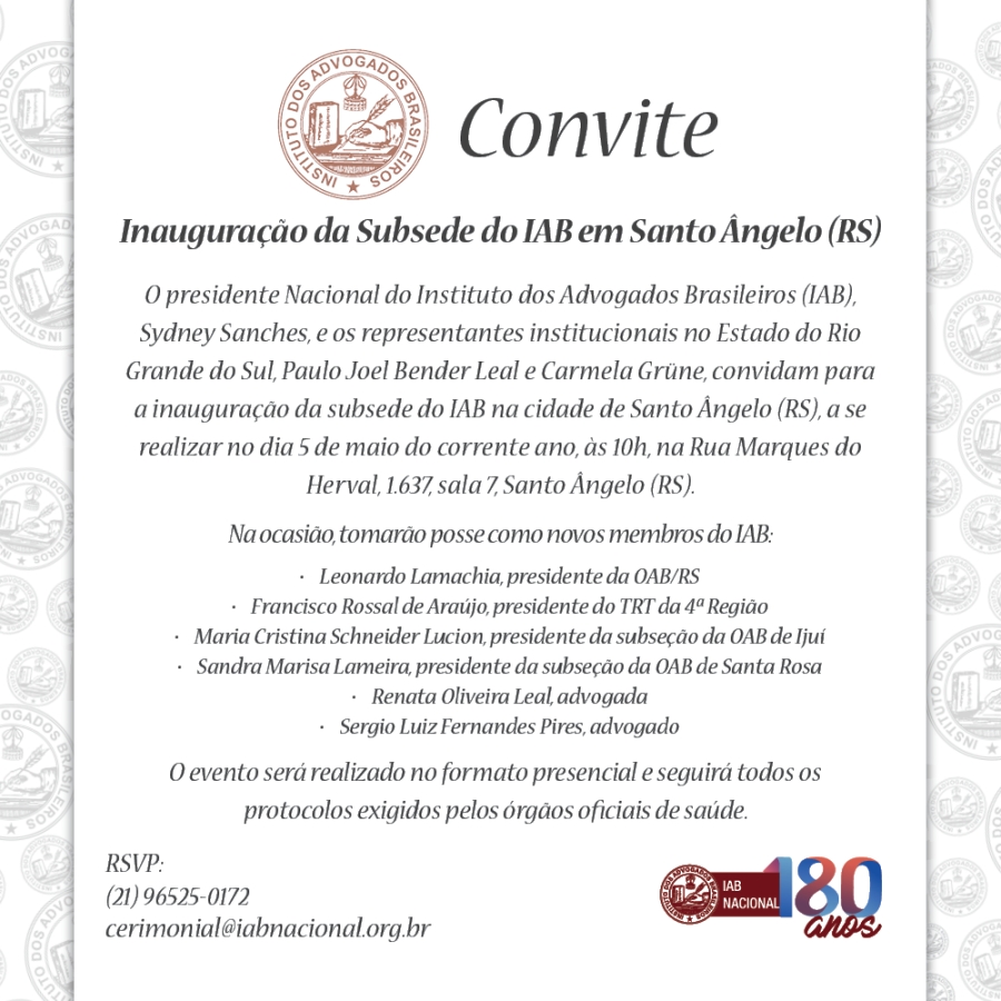O Instituto dos Advogados Brasileiros (IAB) irá inaugurar sua primeira subsede fora das capitais estaduais, na cidade de Santo Ângelo (RS), nesta sexta-feira (5/5), às 10h. A cerimônia acontecerá presencialmente na Rua Marques do Herval, nº 1.637, sala 7. O evento será conduzido pelo presidente nacional do IAB, Sydney Sanches, e contará com a presença dos representantes institucionais da entidade no Estado do Rio Grande do Sul, Paulo Joel Bender Leal e Carmela Grüne.