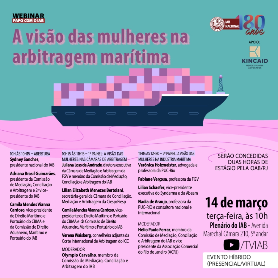 A visão das mulheres nas Câmaras de Arbitragem é o primeiro tema do debate, que terá as contribuições da diretora executiva da Câmara de Mediação e Arbitragem da FGV, Juliana Loss de Andrade, da secretária-geral da Câmara de Conciliação, Mediação e Arbitragem da Ciesp/Fiesp, Lilian Elizabeth Menezes Bertolani, e de Camila Mendes Vianna Cardoso. O segundo painel, intitulado A visão das mulheres na indústria marítima, será conduzido pela advogada e professora da PUC-Rio Verônica Holzmeister, pela professora da FGV Fabiane Verçosa, pela vice-presidente executiva do Syndarma e da Abeam, Lilian Schaefer, e pela professora da PUC-Rio e consultora nacional e internacional Nadia de Araujo.