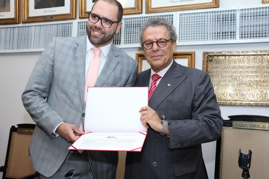 Guilherme Chambarelli Neno recebe o certificado de consócio do IAB das mãos de Técio Lins e Silva