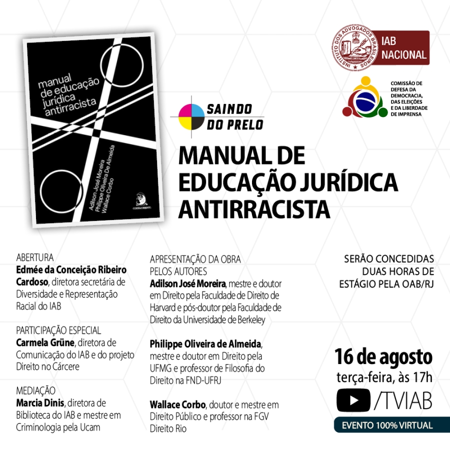A abertura ficará a cargo do presidente nacional do IAB, Sydney Sanches. Os autores farão uma apresentação da obra e o debate terá a participação da diretora de Comunicação do IAB, Carmela Grüne, e da diretora de Biblioteca e idealizadora do projeto Saindo do Prelo, Marcia Dinis. Aos estudantes de Direito que assistirem ao webinar serão concedidas duas horas de estágio pela OAB/RJ.
