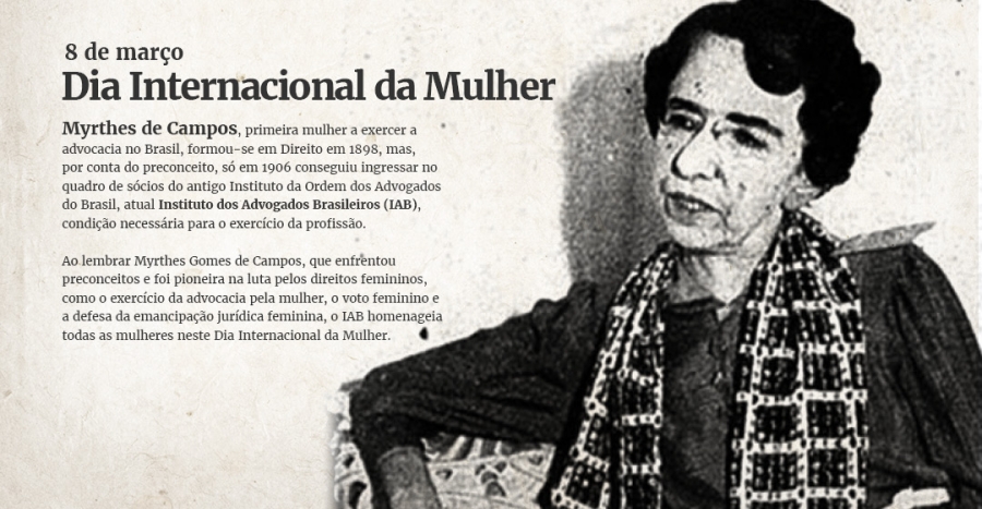 Myrthes Gomes de Campos, primeira mulher a exercer a advocacia no Brasil, formou-se em Direito em 1898, mas, por conta do preconceito, só em 1906 conseguiu ingressar no quadro de sócios do antigo Instituto da Ordem dos Advogados do Brasil, atual Instituto dos Advogados Brasileiros (IAB), condição necessária para o exercício da profissão.