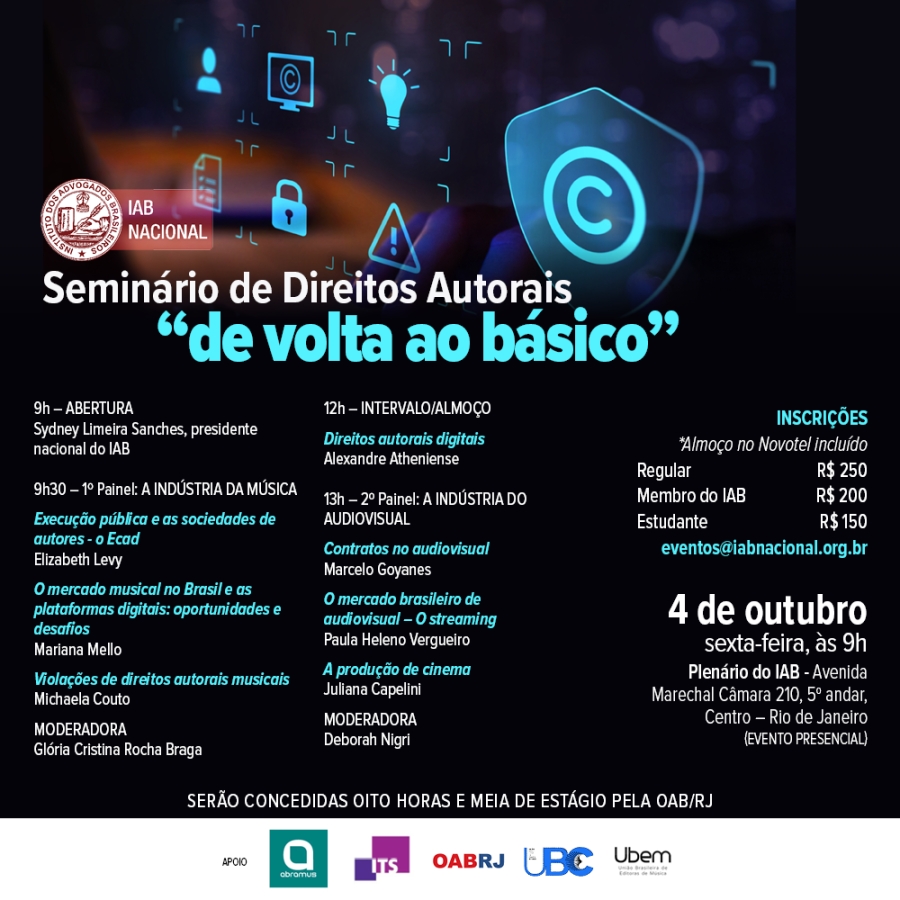 A abertura do evento será realizada pelo presidente nacional do IAB, Sydney Limeira Sanches, que advoga na área de Direitos Autorais. Com a participação de grandes especialistas do setor, o seminário contará com quatro painéis temáticos cujos títulos são: A indústria da música, A indústria do audiovisual, O contencioso autoral e O futuro. Para os estudantes de Direito que participarem do evento também serão disponibilizadas oito horas e meia de estágio pela OAB/RJ.
