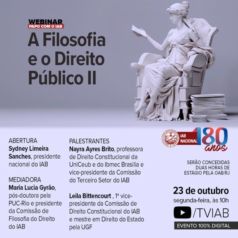 A 1ª vice-presidente da Comissão de Direito Constitucional do IAB e mestre em Direito do Estado pela Universidade Gama Filho (UGF) Leila Bittencourt também fará palestra no webinar, que será mediado pela presidente da Comissão de Filosofia do Direito do IAB, Maria Lucia Gyrão. Os estudantes de Direito que assistirem ao evento receberão duas horas de estágio pela OAB/RJ.