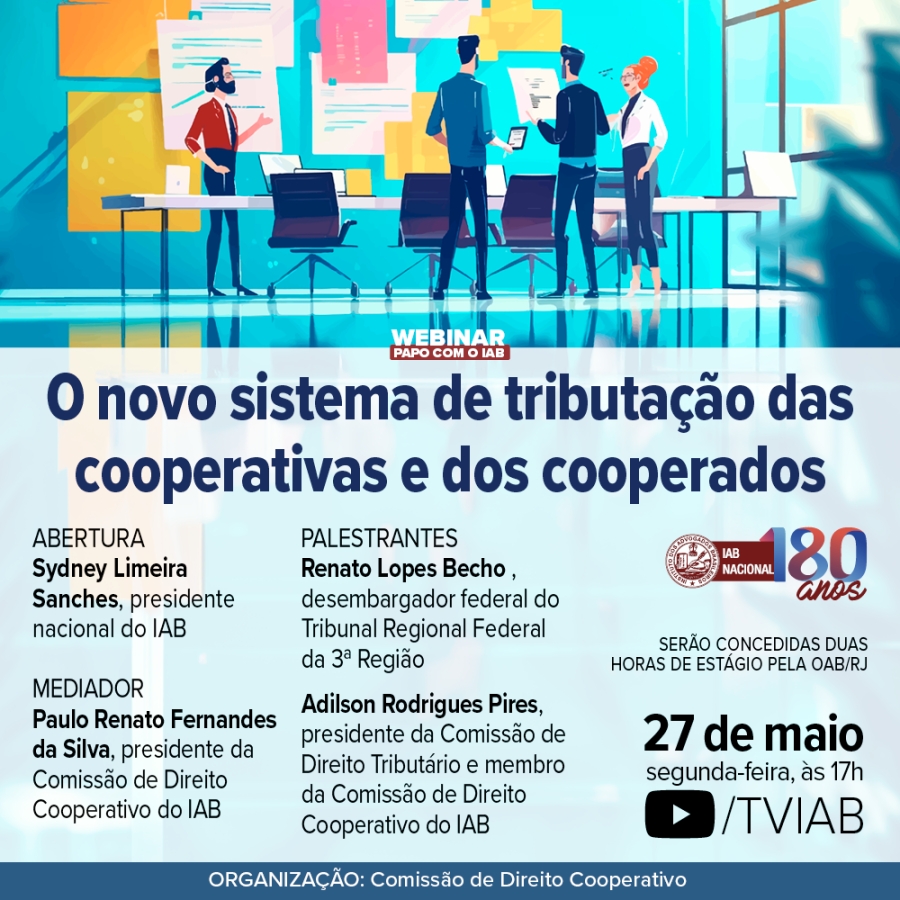 As palestras do evento serão realizadas pelo membro da Comissão de Direito Cooperativo e presidente da Comissão de Direito Tributário do IAB, Adilson Pires, e pelo desembargador federal do Tribunal Regional Federal da 3ª Região Renato Lopes Becho. O presidente da Comissão de Direito Cooperativo do IAB, Paulo Renato Fernandes da Silva, irá mediar o encontro. Os estudantes de Direito que assistirem ao webinar receberão duas horas de estágio pela OAB/RJ.