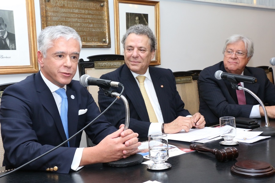 Antes de conhecer o plenário histórico do IAB e receber de Técio Lins e Silva um Certificado de Honra ao Mérito, o presidente da UIA esteve na Biblioteca Daniel Aarão Reis, que reúne um acervo de mais de 60 mil títulos. O advogado português ganhou de Aurélio Wander Bastos um exemplar de Os cursos jurídicos no Brasil – 190 anos. Organizado pelo diretor de Biblioteca e prefaciado por Técio, o livro é uma coletânea de artigos de 19 autores sobre a criação, em 1827, das primeiras faculdades de direito do país.