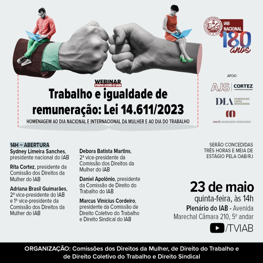 A abertura do evento será realizada pelos presidentes nacional do IAB, Sydney Limeira Sanches, da Comissão dos Direitos da Mulher, Rita Cortez, da Comissão de Direito do Trabalho, Daniel Apolônio, e da Comissão de Direito Coletivo do Trabalho e Direito Sindical, Marcus Vinícius Cordeiro, e pelas 1ª e 2ª vice-presidentes da Comissão dos Direitos da Mulher, Adriana Brasil Guimarães e Debora Batista Martins, respectivamente.