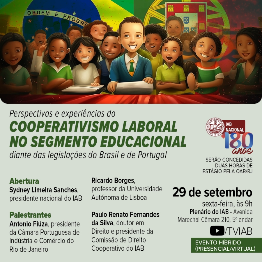 A palestra também terá a participação do presidente da Câmara Portuguesa de Indústria e Comércio do Rio de Janeiro, Antonio Fiúza, e do doutor em Direito e presidente da Comissão de Direito Cooperativo do IAB, Paulo Renato Fernandes da Silva. Os alunos de Direito que assistirem ao webinar receberão duas horas de estágio pela OAB/RJ.