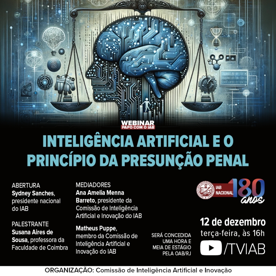 O webinar terá mediação da presidente da Comissão de Inteligência Artificial e Inovação do IAB, Ana Amelia Menna Barreto, e do membro do mesmo grupo Matheus Puppe. Os estudantes de Direito que assistirem à palestra receberão duas horas de estágio pela OAB/RJ.