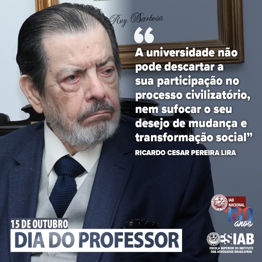 O objetivo do Dia dos Professores é, justamente, reconhecer a importância e o papel fundamental dos mestres na formação e desenvolvimento da sociedade. Além de desenvolver a crítica e a moral, a educação também amplia horizontes e transforma vidas. No Instituto, que é uma academia do Direito, essa visão é reiterada historicamente. O advogado e ex-presidente do IAB, Ricardo Cesar Pereira Lira, afirmou que “a universidade não pode descartar a sua participação no processo civilizatório, nem sufocar o seu desejo de mudança e transformação social”.