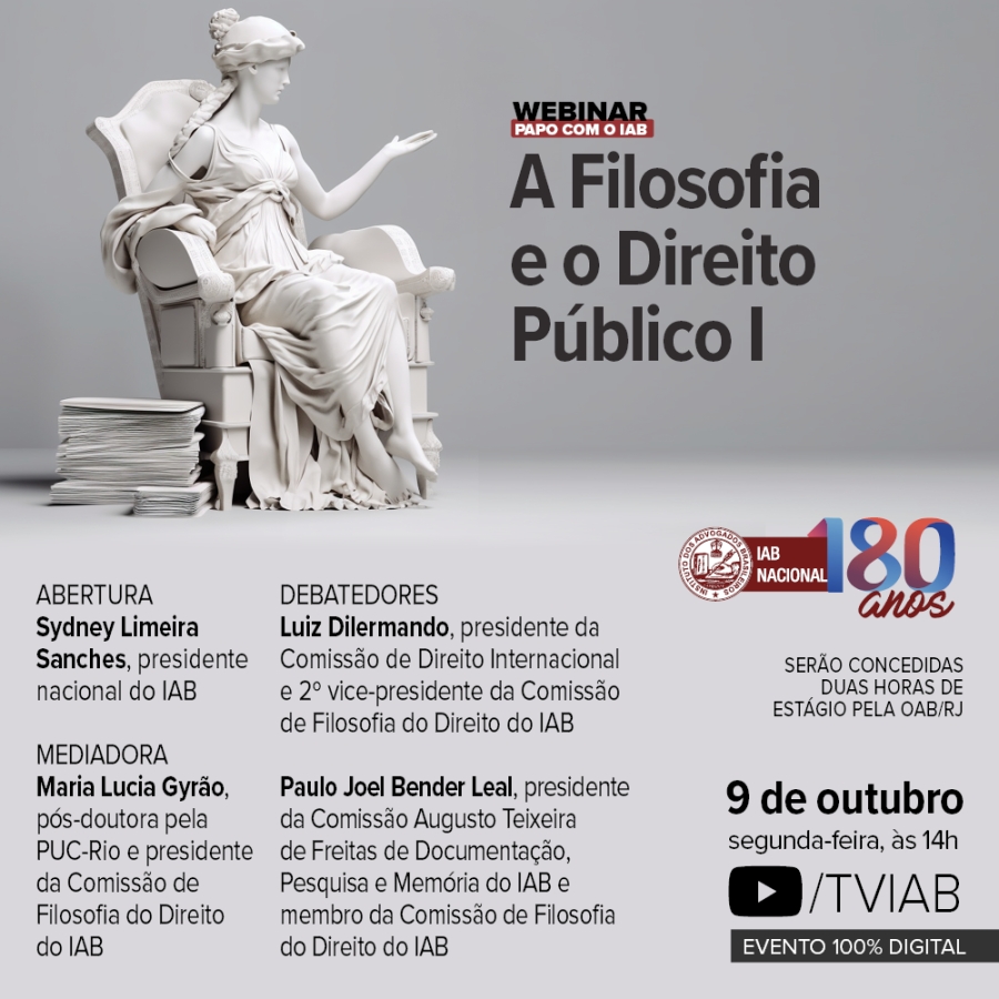 O presidente da Comissão de Direito Internacional do IAB, Luiz Dilermando, e o presidente da Comissão Augusto Teixeira de Freitas de Documentação, Pesquisa e Memória do Instituto, Paulo Joel Bender Leal, serão os debatedores do evento. A mediação da mesa de trabalho ficará a cargo da presidente da comissão organizadora, Maria Lucia Gyrão. Aos estudantes de Direito que assistirem ao webinar serão oferecidas duas horas de estágio pela OAB/RJ.