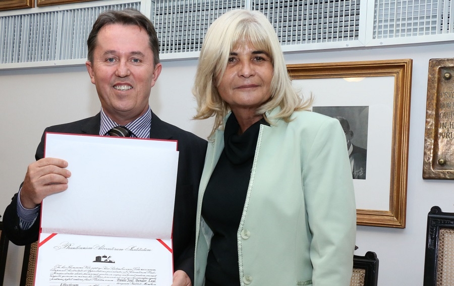 Larissa Clare Pochmann da Silva recebe o diploma de membro honorário pelas mãos de Rita Cortez
