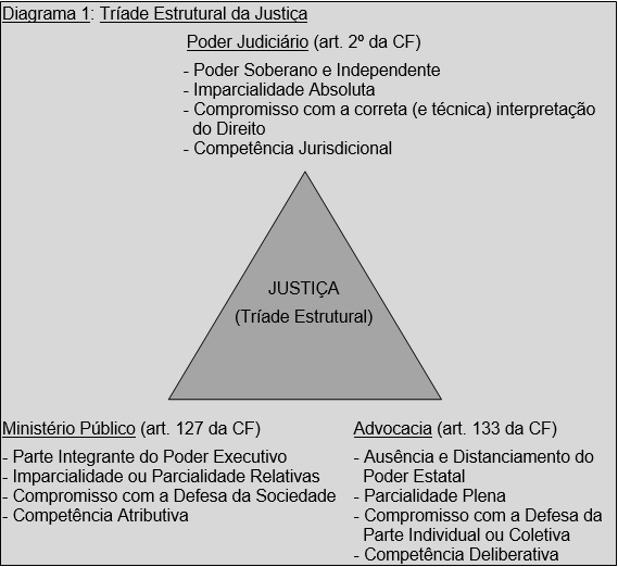 O efeito sinergético da soma das três distintas Instituições, no âmbito da mencionada Tríade Estrutural da Justiça, encontra-se exatamente na complementaridade que cada qual estabelece, através de suas específicas funções; ou seja, o Poder Judiciário com sua soberania, na qualidade de Poder Estatal (art. 2º da CF), incluindo a vitaliciedade funcional de seus membros como titulares do Poder Estatal, dotados de imparcialidade absoluta (compromisso com a correta e técnica interpretação do Direito) e de competência jurisdicional; o Ministério Público com sua autonomia plena (independência funcional), na qualidade de membro do Poder Executivo (Administração Pública Direta Descentralizada), incluindo a vitaliciedade funcional de seus membros como partes integrantes essenciais (art. 127 da CF) do Poder Estatal, dotados de imparcialidade relativa (compromisso com a defesa de uma parte abstrata e coletiva chamada sociedade) e de competência atributiva (custus legis e titular da Ação Penal Pública); e a Advocacia, com seu necessário distanciamento do Estado, na qualidade de Ministério Privado, incluindo a ausência de vinculação como partes indispensáveis (art. 133 da CF) distantes do Poder Estatal, dotados de plena parcialidade (compromisso com a defesa de uma parte concreta, individual ou coletiva) e de competência deliberativa.