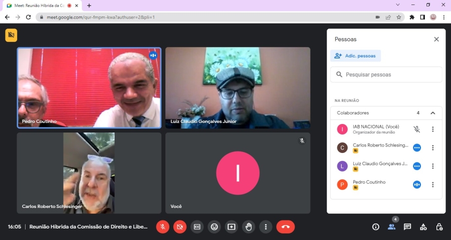 A Comissão de Direito e Liberdade Religiosa-IAB/Nacional reunida hibridamente, em 29.06.2023, as 16h05, à partir da Biblioteca do IAB/Nacional, na Av. Marechal Câmara, 210, 2º Andar, Centro, Rio/RJ, concomitantemente, através da Plataforma ‘Google Meet’ disponibilizada pela Liderança Tecnológica do IAB, sob a Presidência do Dr. Gilberto Garcia, com a Presença do Dr. Paulo Maltz, e contando com a Participação Eletrônica dos Membros: Dr. Carlos Schlesinger (1º Vice-Presidente), e, Dr. Luiz Claudio Gonçalves Junior (Guaratinguetá/SP), e, ainda, com Justificativa de Ausência dos Membros: Dr. João Theotonio Mendes de Almeida Junior (2º Vice-Presidente), e, da Dra. Laura Berquó (João Pessoa/PB), tendo sido Apreciados os Itens da Pauta, pelos Membros Presentes na Reunião: 003/2023, Bimensal Híbrida, (Presencial e On-Line), deste dia: