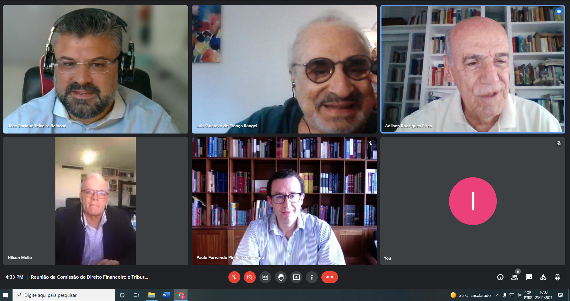 Ficou acertada que a próxima reunião, online, e última do ano da Comissão de Direito Financeiro e Tributário será realizada no dia 14 de dezembro, às 16:30 h, em face do início do recesso das atividades do IAB marcado para o dia 15/12/2021.