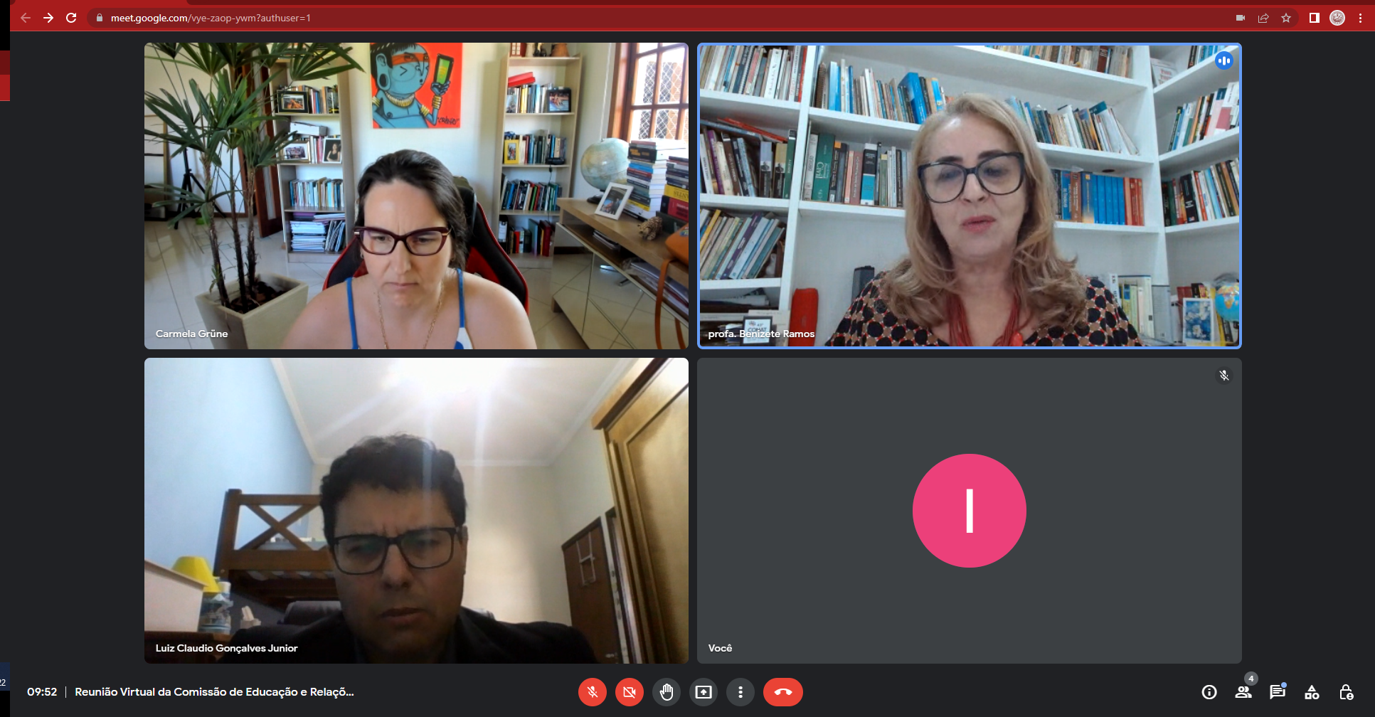 Aos vinte e oito dias do mês de outubro de 2023, as 09.30h, foi aberta a segunda reunião da CDAU/IAB (Comissão de Educação e Assuntos Universitários do IAB). Estiveram presentes em plenário virtual, a presidente da Comissão de Educação, Benizete Ramos de Medeiros, a vice-presidente, Carmela Grume, o membro, Luiz Claudio Gonçalves Junior. Justificou a ausência Sergio Santana, com quem a presidente da comissão conversou por telefone, antes da reunião acerca da relatoria da PEC 206/2019.