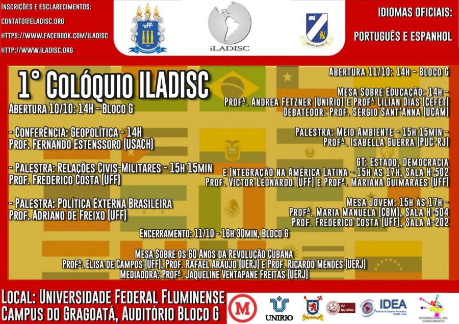 Dia 10 de outubro 2019, às 14h e 11 de outubro de 2019, às 14h - Local: Universidade Federal Fluminense, Campus do Grogoata, Auditório Bloco G.