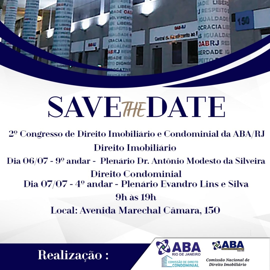 Dias 06 e 07/07/2023, 9h às 19hSede da OAB-RJ - Av. Marechal Câmara, 150 Inscreva-sehttps://www.sympla.com.br/evento/2-congresso-de-direito-imobiliario-e-condominial-da-aba-rj/2006035