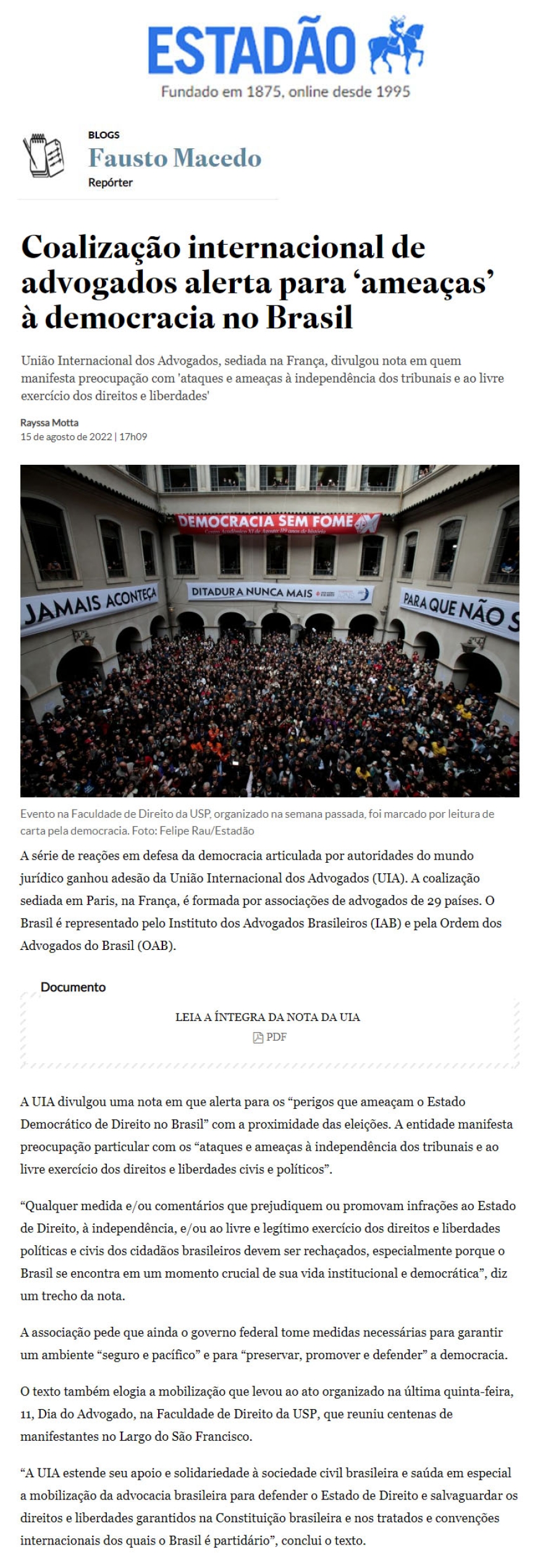 FONTE: O Estadão - 15/08/2022