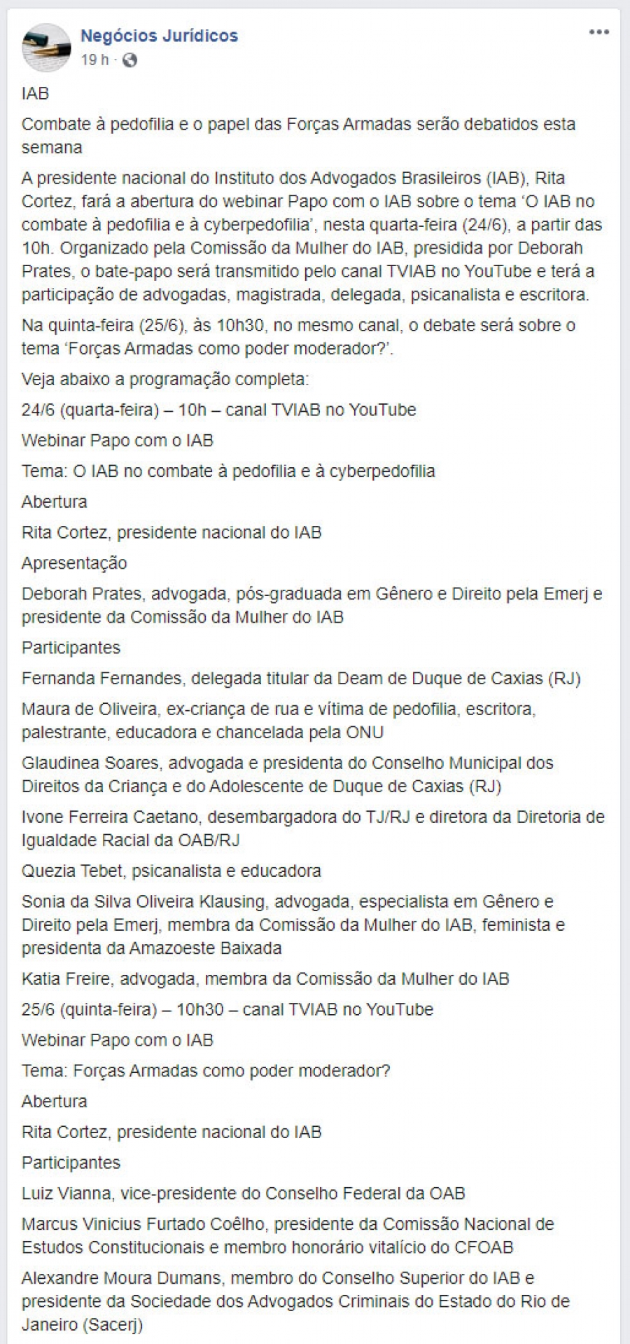 Combate à pedofilia e o papel das Forças Armadas serão debatidos pelo IAB, esta semana