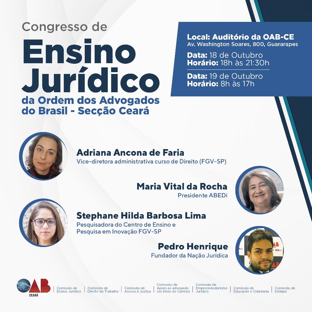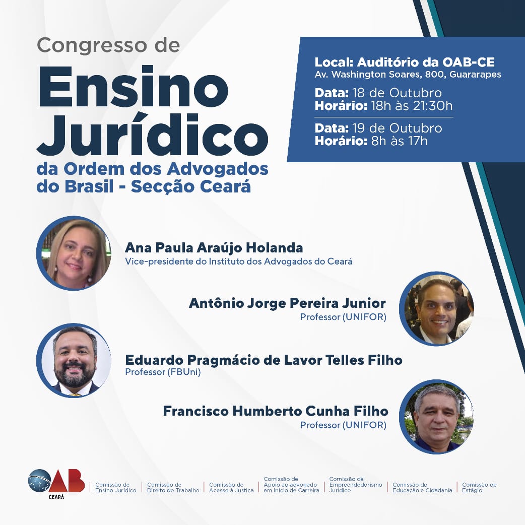 Dia 18 outubro de 2019, das 18h às 21h e 19 de outubro de 2019, das 8h às 17h - Local: Auditório da OAB-CE, Avenida Washington Soares nº 800, Guararapes.