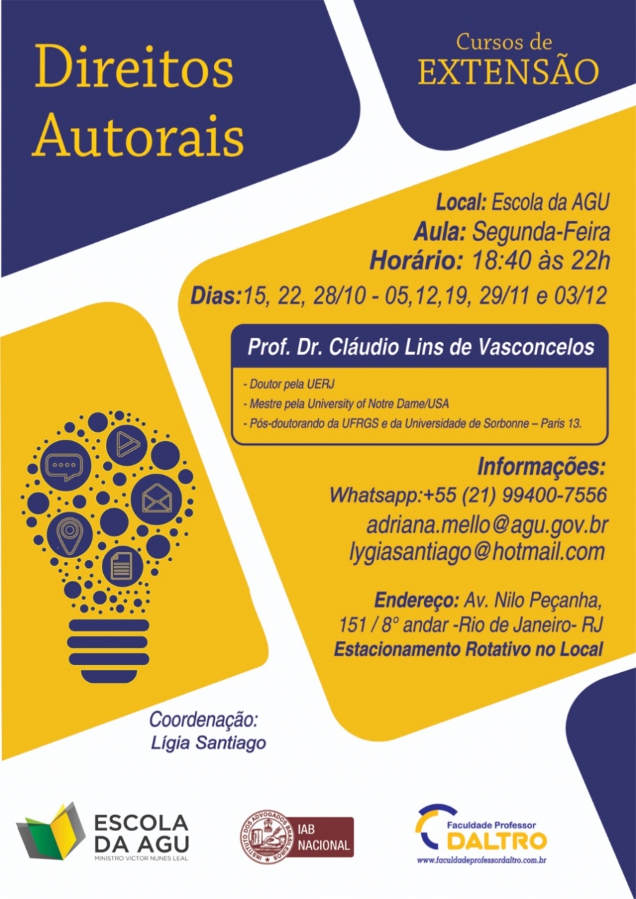 Dias: 15, 22, 28/10 - 05, 12, 19, 29/11 e 03/12 - horário: das 1840h às 22:00h - LOCAL: Escola da AGU.