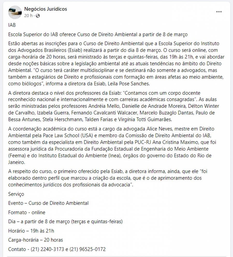Escola Superior do IAB oferece Curso de Direito Ambiental a partir de 8 de março