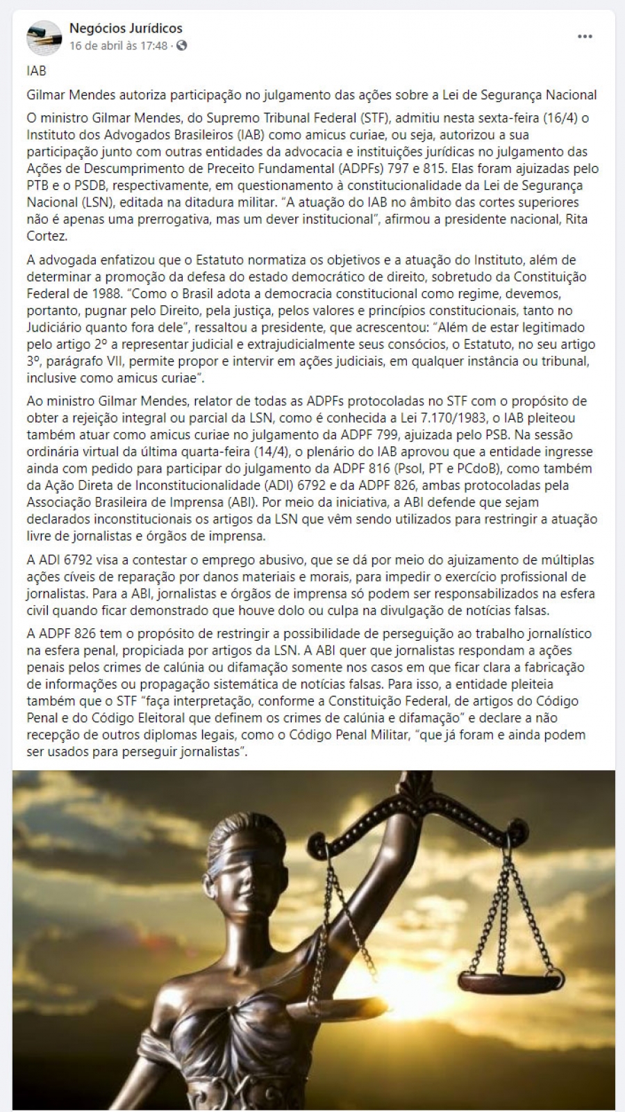 Gilmar Mendes autoriza participação do IAB no julgamento das ações sobre a Lei de Segurança Nacional