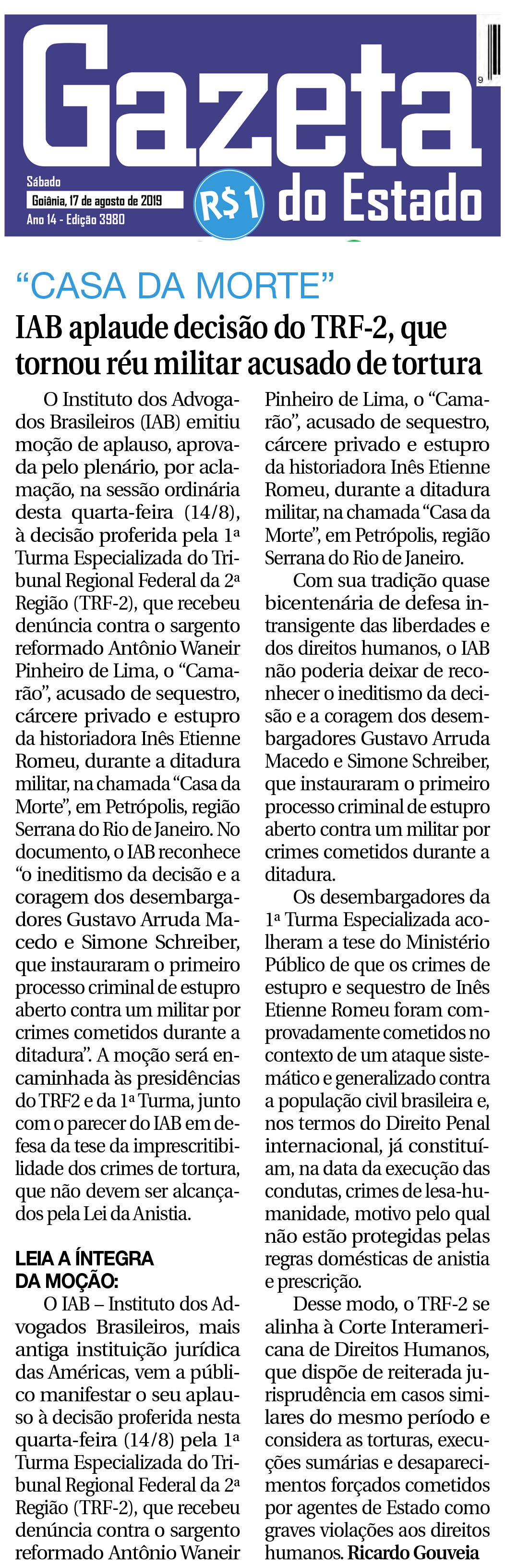 FONTE: Gazeta do Estado (GO) - 17/08/2019