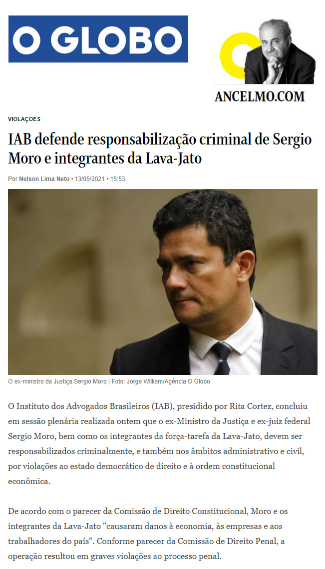 IAB defende responsabilização criminal de Sergio Moro e integrantes da Lava-Jato