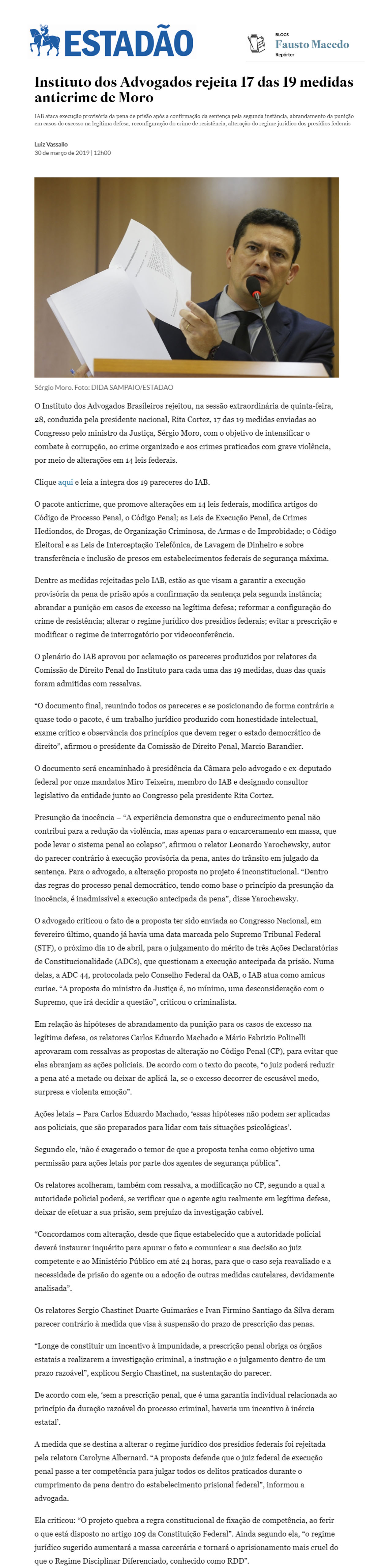 IAB rejeita 17 das 19 medidas do pacote anticrime de Moro