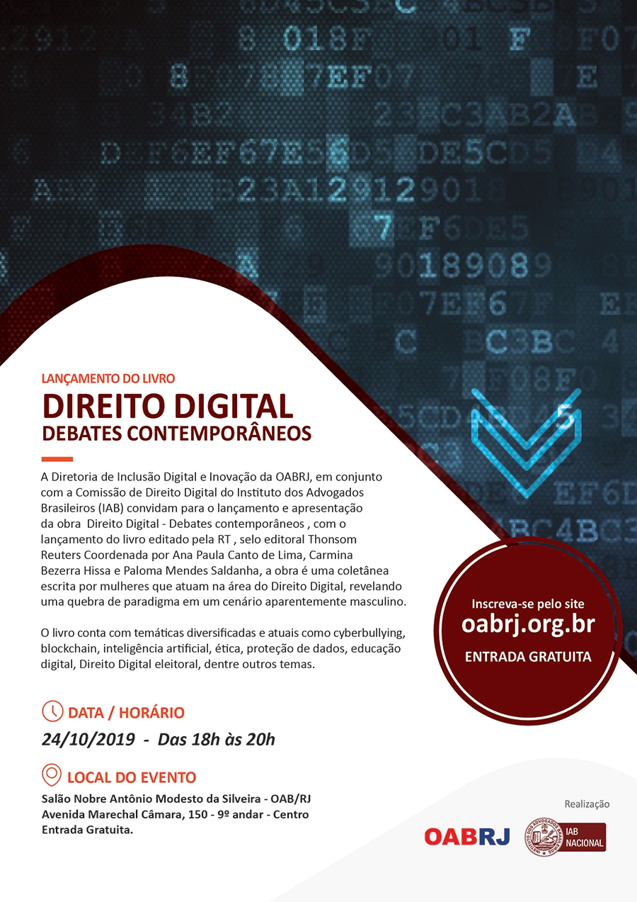 Dia 24 outubro de 2019, das 18h às 20h - Local: Salão Nobre Antônio Modesto da Silveira - OAB/RJ - Avenida Marechal Câmara, 150 - 9º andar - Centro