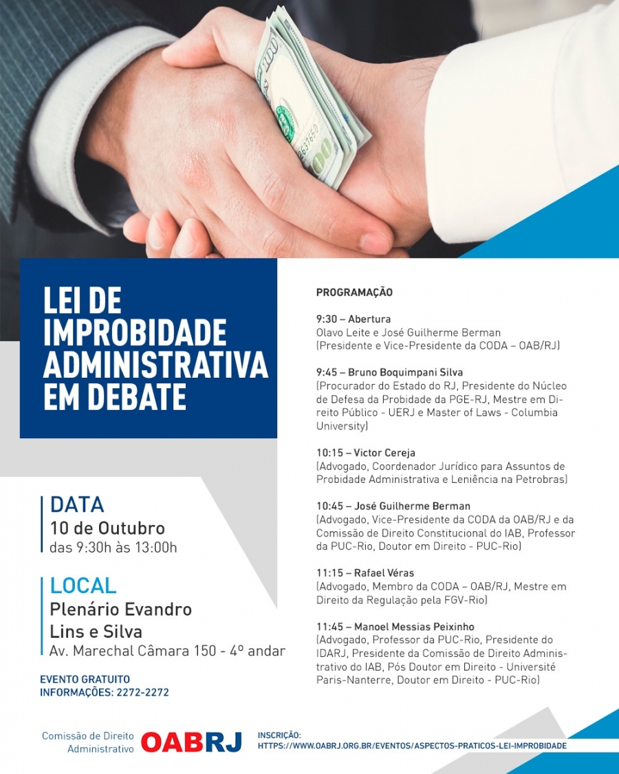 Dia, 10 de outubro de 2019, das 09h30 às 13h, Local: Plenáro Evandro lins e Silva nº 150, 4º andar - OAB-RJ, Centro - Rio de Janeiro - RJ.