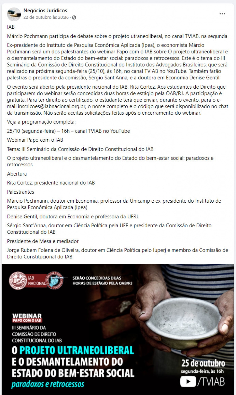 Márcio Pochmann participa de debate sobre o projeto utraneoliberal, no canal TVIAB, nesta segunda