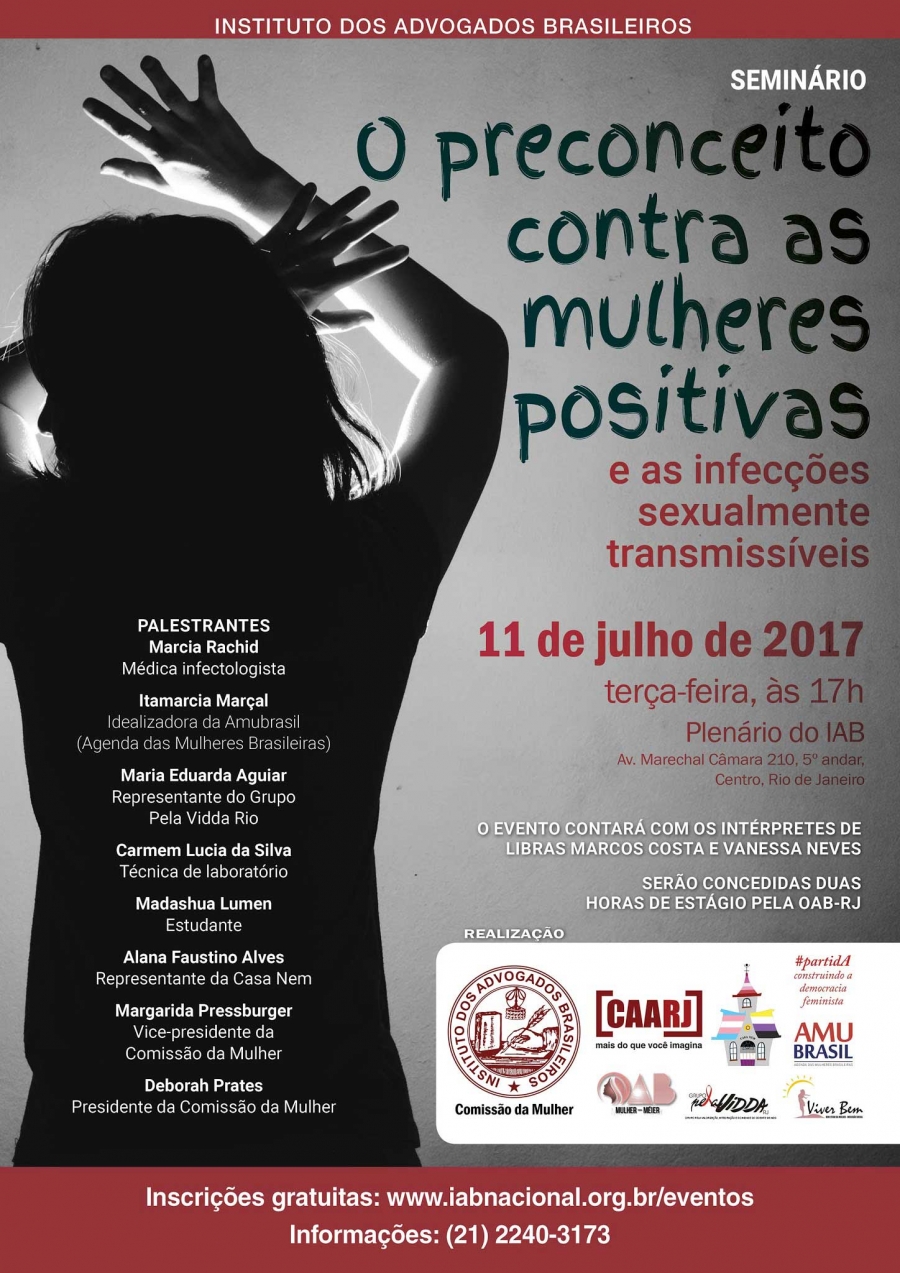 Fundo em cinza, num tom claro. No canto direito superior há o título do evento, dividido em duas fontes diferentes. Em verde escuro e maior está escrito “O preconceito contra as mulheres positivas”. Logo abaixo, em vermelho e de menor tamanho está escrito “e as infecções sexualmente transmissíveis”. Abaixo do título vem, em vermelho, os dados do evento. 11 de julho de 2017, terça-feira, às 17 horas. Plenário do IAB. Avenida Marechal Câmara 210, 5º andar, Centro, Rio de Janeiro. Abaixo, ainda à direita e em branco, está escrito: O evento contará com os intérpretes de libras Marcos Costa e Vanessa Neves. Serão concedidas duas horas de estágio pela OAB-RJ. Abaixo estão as logos dos realizadores do evento: Comissão da Mulher IAB, CAARJ (Caixa de Assistência dos Advogados do Rio de Janeiro), OAB Mulher Méier, Casa Nem, Grupo Pela Vidda RJ, Movimento #partidA (Construindo a democracia feminista), AMUBRASIL e Viver Bem. Do lado esquerdo do cartaz, desde em cima até embaixo, está uma silhueta feminina de costas em posição de defesa, com os braços levantados e as mãos espalmadas viradas para fora protegendo o rosto. Nesta silhueta preta, escrito em branco, encontram-se os nomes das palestrantes: Marcia Rachid (médica infectologista), Itamarcia Marçal (Idealizadora da Amubrasil – Agenda das Mulheres Brasileiras), Maria Eduarda Aguiar (Representante do Grupo Pela Vidda Rio), Carmen Lucia da Silva (Técnica de Laboratório), Madashua Lumen (Estudante), Alana Faustino Alves (Representante da Casa Nem), Margarida Pressburger (Vice-presidente da comissão da Mulher) e Deborah Prates (Presidente da Comissão da Mulher). No rodapé do cartaz está escrito: Inscrições gratuitas pelo site www.iabnacional.org.br/eventos. Informações pelo telefone (21) 2240-3173.