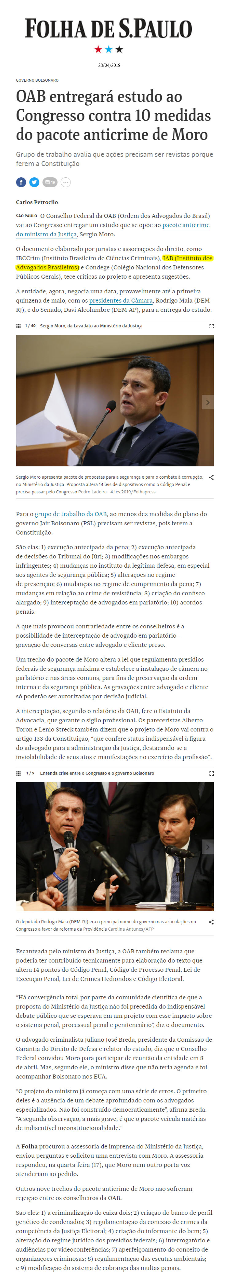 OAB entregará estudo ao Congresso contra 10 medidas do pacote anticrime de Moro