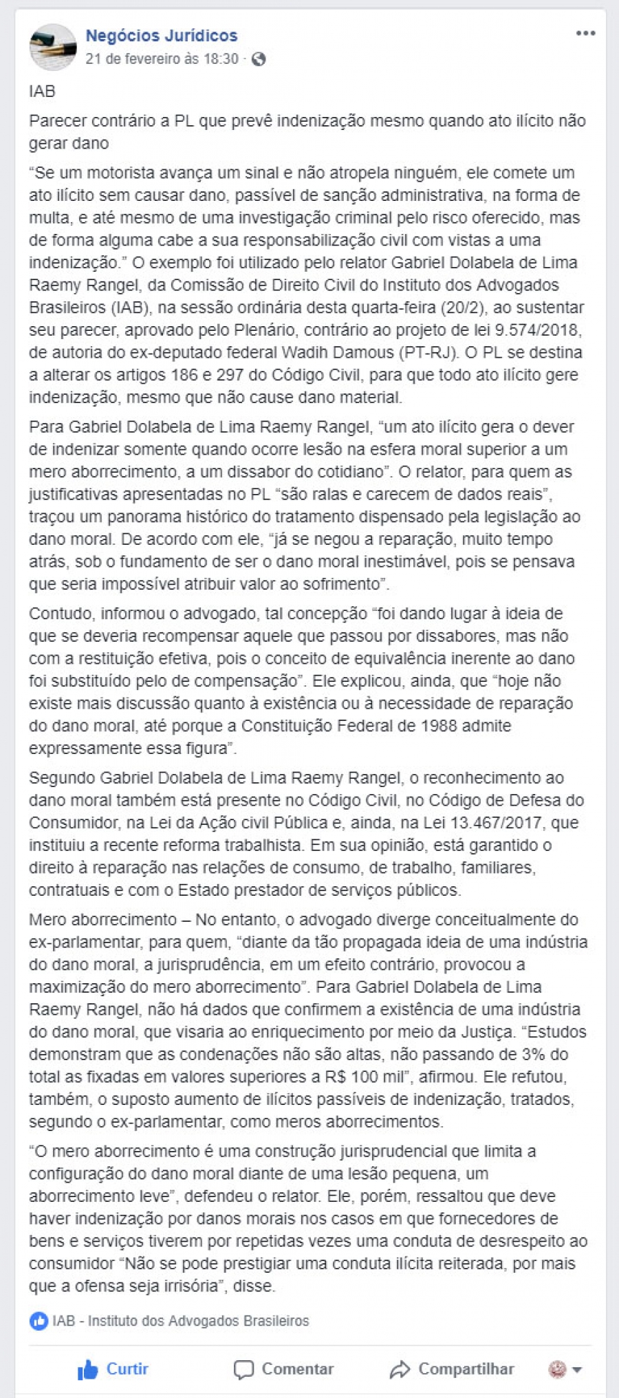 Parecer contrário a PL que prevê indenização mesmo quando ato ilícito não gerar dano