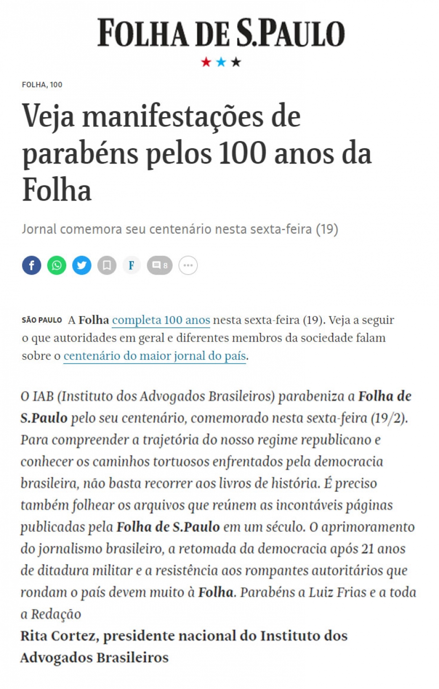 Veja manifestações de parabéns pelos 100 anos da Folha