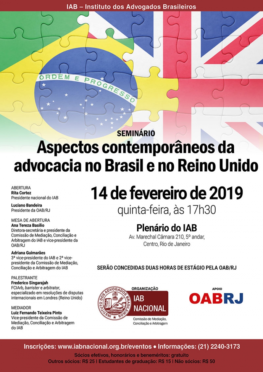 Único advogado brasileiro autorizado a atuar em disputas internacionais na Suprema Corte do Reino Unido, o especialista em cortes superiores Frederico Singarajah será o palestrante do seminário sobre Aspectos contemporâneos da advocacia no Brasil e no Reino Unido, que será realizado no dia 14 de fevereiro, às 17h30, no plenário do Instituto dos Advogados Brasileiros (IAB), no Centro do Rio. Organizado pela Comissão de Mediação, Conciliação e Arbitragem do IAB, com apoio da OAB/RJ, o evento será aberto pela presidente nacional do IAB, Rita Cortez, e o presidente da OAB/RJ, Luciano Bandeira.