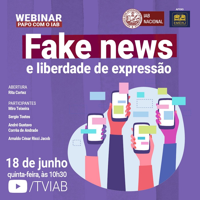 Card com fundo roxo contendo o título do evento, onde o termo 'Fake news' está em destaque. Há uma ilustração de mãos erguendo seus celulares, de onde parecem sair caixas com mensagens e notícias. No alto, as logomarcas do Institudo dos Advogados Brasileiros e da Escola da Magistratura do Estado do Rio de Janeiro, que apoia a realização do evento. Há também informações sobre a transmissão pelo canal TVIAB no YouTube.