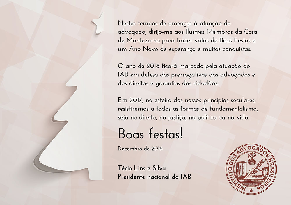 O Instituto dos Advogados Brasileiros (IAB) informa que as suas atividades – interrompidas com o recesso iniciado no dia 8 de dezembro – serão retomadas no dia 1º de fevereiro de 2017, quando voltarão a ser realizadas reuniões nas comissões temáticas. Durante o recesso, a Secretaria do IAB funcionará normalmente, no horário de expediente.