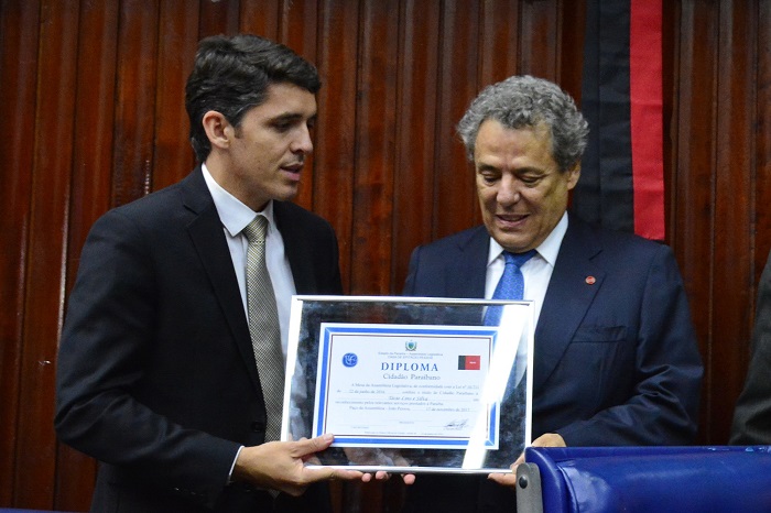 O deputado Tovar Correia Lima entrega a Técio o Título de Cidadão Paraibano (Fotos ALPB)