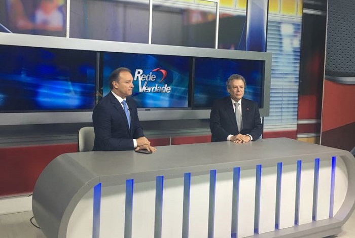 O jornalista Adelton Alves e Técio Lins e Silva no estúdio da TV Arapuan