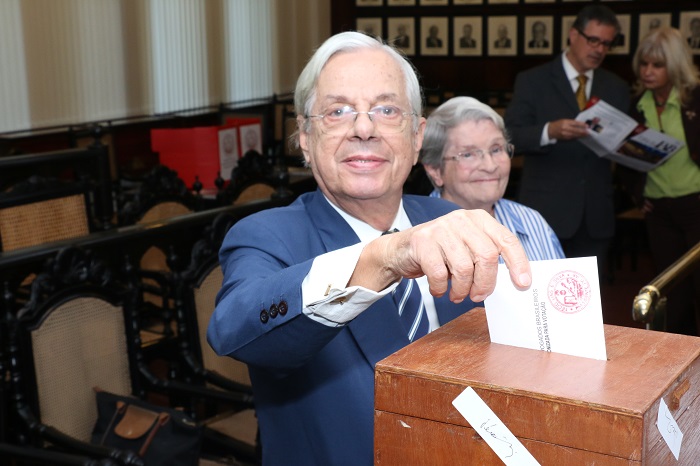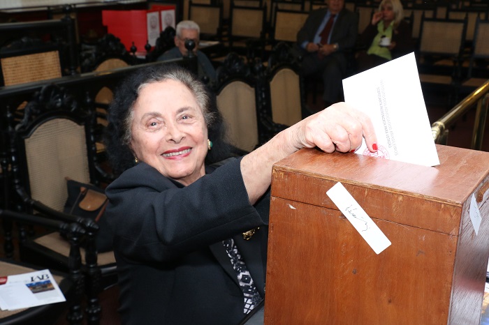 Hariberto de Miranda Jordão Filho. Atrás, Margarida Pressburger aguarda para depositar o seu voto