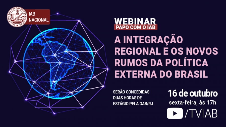 O Instituto dos Advogados Brasileiros (IAB) realizará evento sobre ‘A integração regional e os novos rumos da política externa do Brasil: crises e paradoxos’, na próxima sexta-feira (16/10), às 17h, pelo canal TVIAB no YouTube. Aos estudantes de Direito serão concedidas duas horas de estágio pela OAB/RJ. A participação é gratuita. O controle será feito pelo chat, onde o aluno deverá se identificar com nome e e-mail. O webinar Papo com o IAB será aberto pela presidente nacional, Rita Cortez.