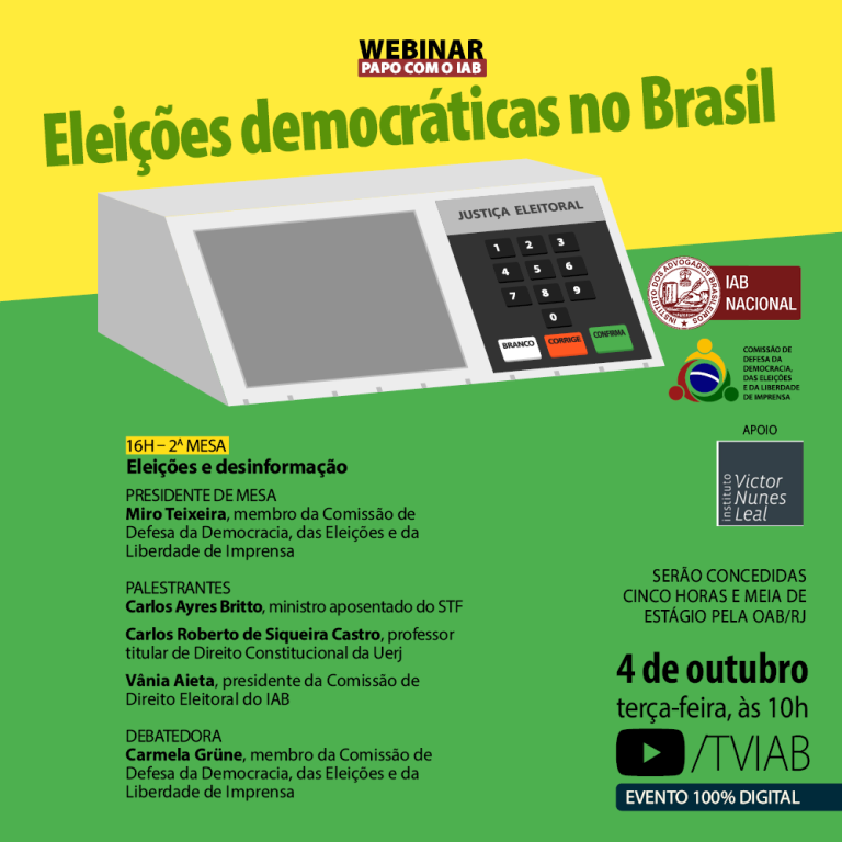 Na mesa de abertura estarão os presidentes do IAB, Sydney Sanches; da Associação Brasileira de Imprensa (ABI), Octávio Costa; da Associação dos Magistrados Brasileiros (AMB), Renata Gil; do Conselho Curador do Instituto Victor Nunes Leal (IVNL), Pedro Gordilho, e da Comissão de Defesa da Democracia, das Eleições e da Liberdade de Imprensa, Bernardo Cabral. Aos estudantes de Direito que assistirem ao webinar serão concedidas cinco horas e meia de estágio pela OAB/RJ.