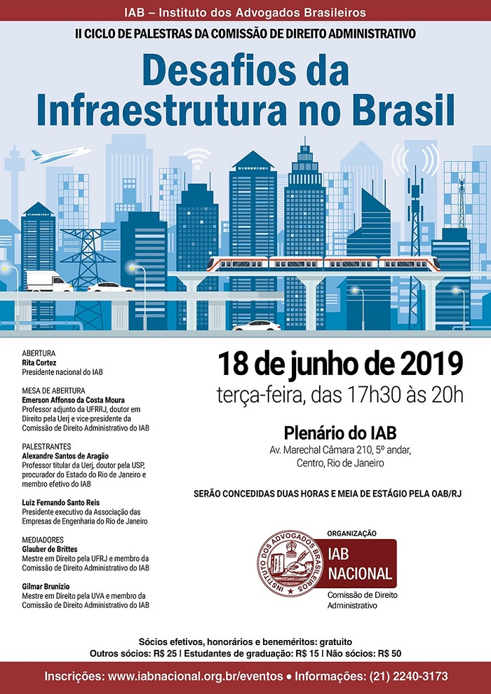 Desafios da infraestrutura no Brasil e será realizado na próxima terça-feira (18/6), das 17h30 às 20h, no plenário do IAB, no Centro do Rio. O evento será aberto pela presidente nacional do IAB, Rita Cortez. As inscrições podem ser feitas no site