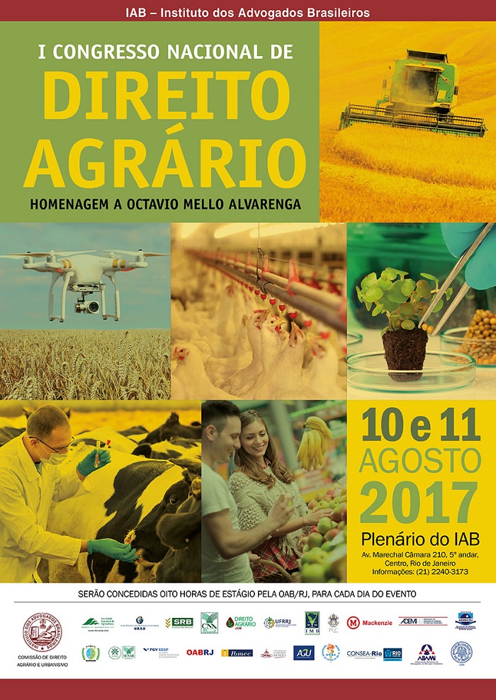 O congresso está sendo organizado pela Comissão de Direito Agrário e Urbanismo do IAB, a Sociedade Nacional de Agricultura (SNA), a União Brasileira dos Agraristas Universitários (Ubau) e a Sociedade Rural Brasileira (SRB). A mesa de abertura será composta pela 1ª vice-presidente do IAB, Rita Cortez; os presidentes da SNA, Antonio Alvarenga, da SRB, Marcelo Vieira, da Ubau, Darcy Zibetti, e da Associação dos Juízes Federais do Rio de Janeiro e Espírito Santo (Ajuferjes), Fabrício Fernandes; o vice-presidente da OAB/RJ, Ronaldo Cramer, e o secretário Índio da Costa.