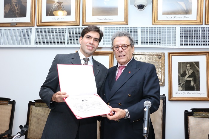 Francisco de Paula Eugênio Jardim de Souza Brasil recebe o certificado pelas mãos de Técio Lins e Silva
